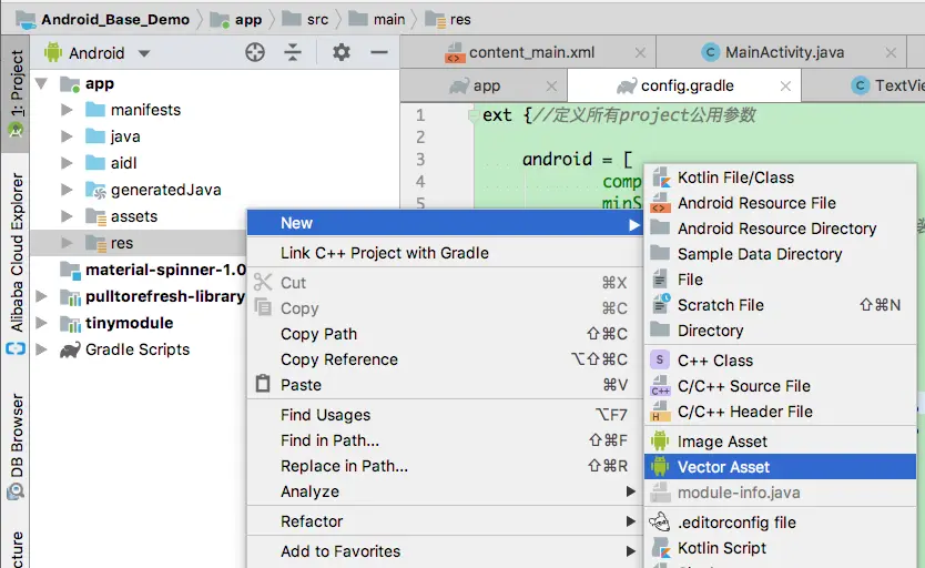 ②然后右键点击res文件夹,选择New > Vector Asset,