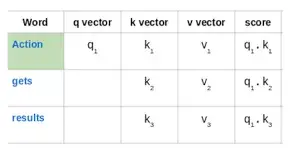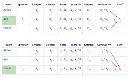 第一个单词的得分是通过将查询向量(q1)的点积与所有单词的关键矢量(k1,k2,k3)进行计算得出的: