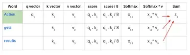 3. 以“Action gets results”这一短语为例。为计算第一个单词“Action”的自注意力,将计算短语中与“Action”相关的所有单词的分数。当对输入序列中某个单词编码时,该分数将确定其他单词的重要性。