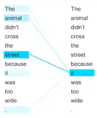 “it”指的是街道还是动物?对人们来说,这是个简单的问题。但对于算法而言,并非如此。模型处理“它”一词时,自注意力试图将“它”与同一句子中的“animal”联系起来。