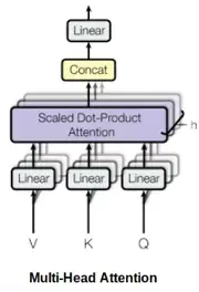 在Transformer的框架中,多次而非一次并行或独立地计算自注意力。因此,自注意力被称为多头注意力。输出的连接与线性转换如下图所示: