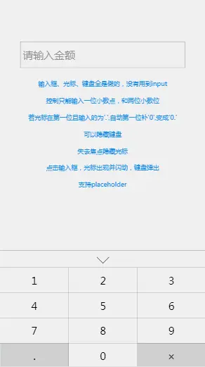- 如果你是强迫症,用户体验之上者,那么你就可以跟我一样做个假键盘,这样以上问题都不是问题。还可以添加附加功能,比如输入的时候若在第一位输入小数点的时候,前面自动补'0';删除的时候,若小数点在第一位前面自动补'0';还可以定制光标颜色、键盘样式等等。