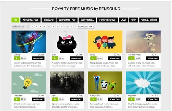 在做PPT的时候我们经常还会用到配乐,所以小编在这里给大家介绍一个音乐网站:BENSOUND,这个网站有很多国外的背景音乐,各种风格的都有,特别带感,而且全都可以免费下载~有了它,就不用但新配乐的问题啦!