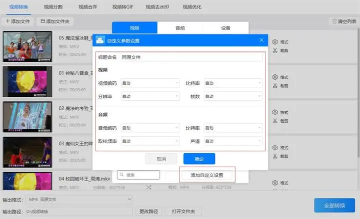 3、如果觉得软件预设的参数满足不了使用需求可以点击“添加自定义设置”按钮自定义视频(视频编码、比特率、分辨率、帧数)和音频(音频编码、比特率、取样频率、声道)的各项参数以满足使用需求。