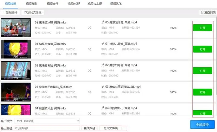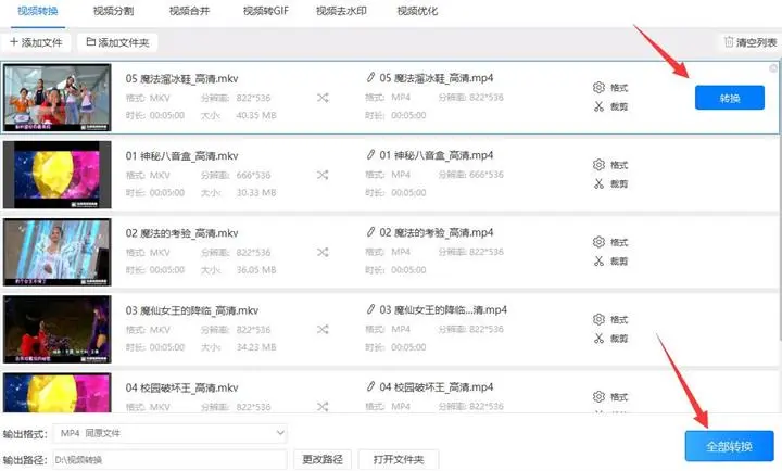5、以上步骤完成后依次点击鼠标悬停时出现的“转换”按钮逐个转换视频或者点击软件右下角固定的“全部转换”按钮同意把mkv格式转换成mp4格式。