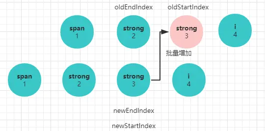oldStartIndex不断逼近oldEndIndex,newStartIndex不断逼近newEndIndex。当oldEndIndex <= oldStartIndex说明旧节点已经遍历完了,此时只要批量增加新节点即可。当newEndIndex <= newStartIndex说明旧节点还有剩下,此时只要批量删除旧节点即可。
