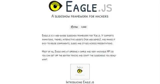 Eagle.js 是一个基于 Vue.js Web 框架构建的幻灯片系统。它支持动画、主题、互动小部件(用于网络演示),并且可以轻松地在演示文稿之间重用组件、幻灯片和样式。