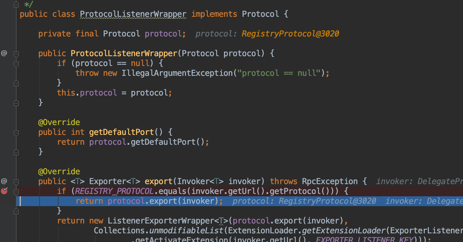 由于Dubbo的SPI机制,ProtocolListenerWrapper是Protocol扩展的包转类(即是构造函数传入的是Protocol类型参数),ProtocolListenerWrapper是默认激活的,这个知识点是在前面介绍Dubbo的SPI机制详细介绍过.