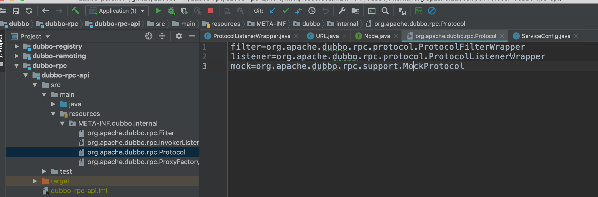 这里dubbo-rpc-api.jar包里META/dubbo/internal下配置ProtocolFilterWrapper和ProtocolListenerWrapper是Protocol下是Protocol的包装类,这个两个会默认执行.