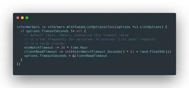 在后续越来越多的系统 Daemonset 上线之后,团队发现,即使做到了所有客户端使用 Informer,集群内的 List Pod 请求依旧很多。这主要是 Kubelet 和 Daemonset 带来的,可以用 Bookmark 特性来解决这个问题,在未上线 Bookmark 的集群内,可以调整 API Server 对资源的更新事件缓存量来缓解该问题 (如 --watch-cache-sizes=node#1000,pod#5000),同时调整 Daemonset Re-Watch 的时间间隔: