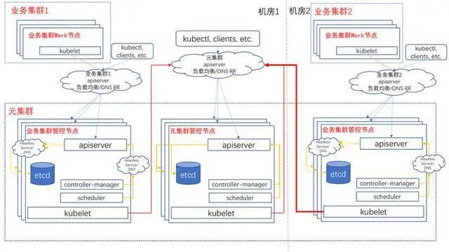 为此,开发团队设计出了 Kube-on-Kube-Operator,它的用途是将各个机房交付给用户的 Kubernetes 集群(称为 “业务集群”) 的组件和服务也都跑在一个 Kubernetes (称为 “元集群”) 上。下图是Kube-on-Kube-Operator的核心架构图: