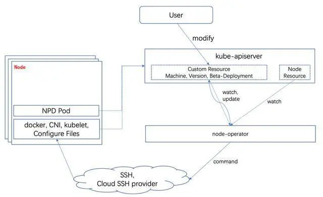 Node-Operator 正是在这样的背景下诞生的,其使用声明式编程、面向终态的特性去管理 Worker节点。Node-Operator 的职责涵盖从云厂商购买计算节点开始到接管 Kubenertes 节点整个生命周期:从初始化证书、kubelet 以及节点必要组件,到自动化升级组件版本,再到最后的节点下线。同时,Node-Opeator 也会订阅 NPD(Node Problem Detector) 上报的节点故障信息,进行一系列自动化修复。下图是 Node-Operator 的核心架构图: