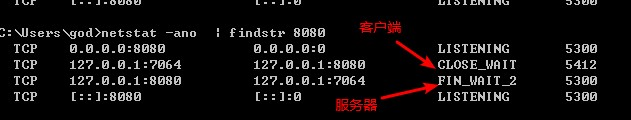 从这个样例可以看到,客户端和服务器都能根据自身的策略,与对端断开连接,本例中是服务器首先断开连接,根据TCP协议,必然有一个时刻服务器处于FIN_WAIT_2状态,而客户端处于CLOSE_WAIT状态
