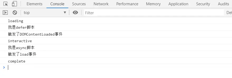 document.readyState,可以看到确实如上面所说的顺序所打印,而这个属性就是代表了文档的一个加载的过程,下面我们再来看看如果在脚本中加入了defer和async又会发生什么