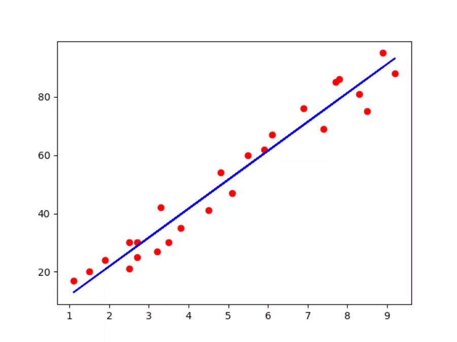 import pandas as pd import numpy as np import matplotlib.pyplot as plt dataset = pd.read_csv('studentscores.csv') X = dataset.iloc[ : , : 1 ].values Y = dataset.iloc[ : , 1 ].values from sklearn.model_selection import train_test_split X_train, X_test, Y_train, Y_test = train_test_split( X, Y, test_size = 1/4, random_state = 0) 第二步:训练集使用简单线性回归模型来训练