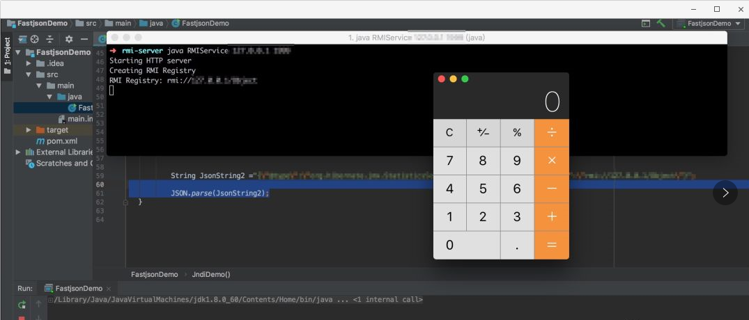 利用该0day漏洞,恶意攻击者可以构造攻击请求绕过FastJSON的黑名单策略。例如,攻击者通过精心构造的请求,远程让服务端执行指定命令(以下示例中成功运行计算器程序)。