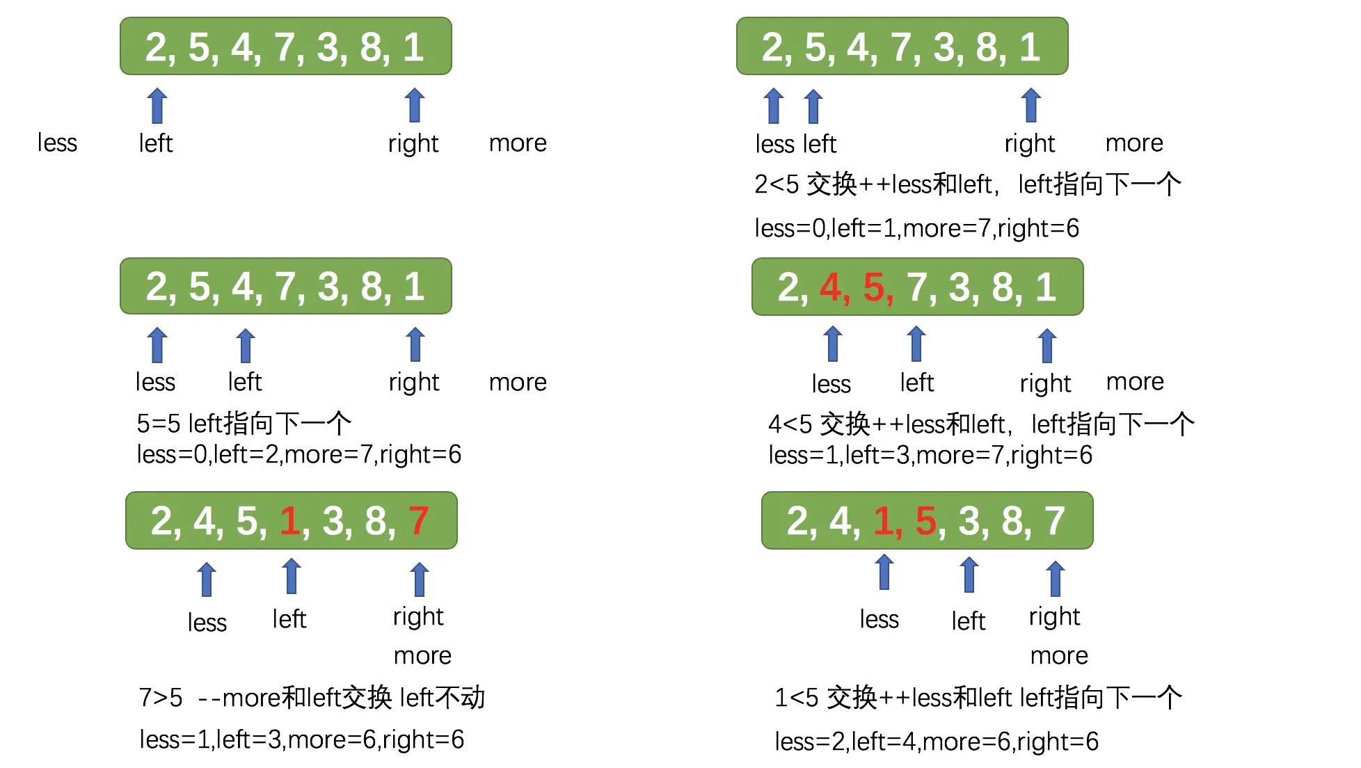 3、结束条件,只有arr[left]<number时,left向右侧移动,left不会和less重合。因此需要考虑右边界,右边界从右向左逐渐接近left,因此当left和more重合时,循环结束。