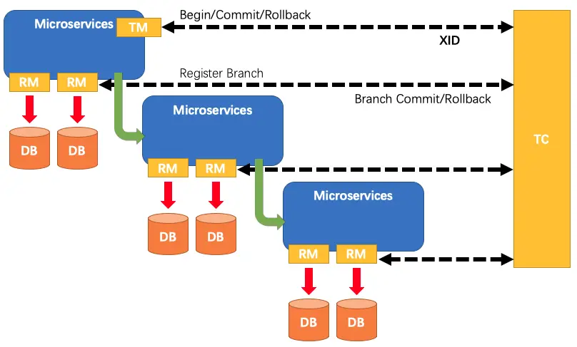 RM将本地事务注册为XID到TC的相应全局事务的分支。