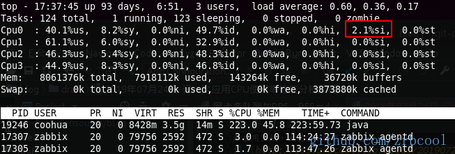 - 从cpu使用率的细节发现%si中断使用率集中在cpu0上,查看中断类型