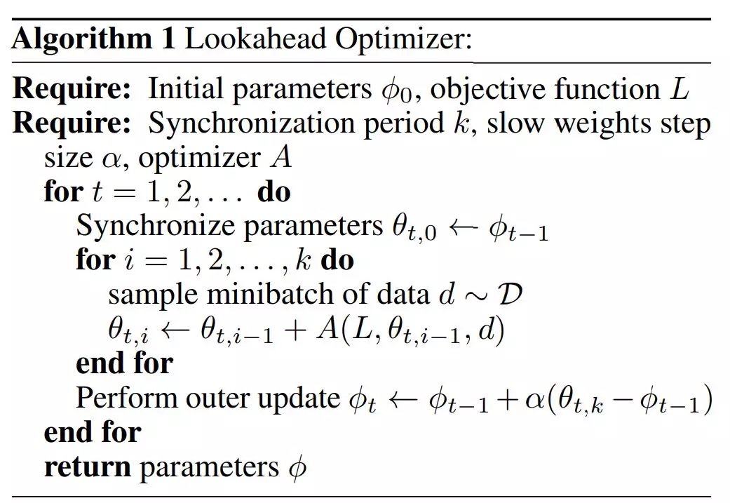 slow weights 每更新一次,fast weights 将被重置为目前的 slow weights 值。Lookahead 的伪代码见下图 Algorithm 1。