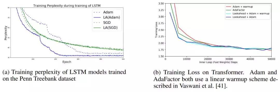 研究者还在 Penn Treebank 数据集上训练 LSTM 语言模型,在 WMT 2014 English-to-German 数据集上训练基于 Transformer 的神经机器翻译模型。在所有任务中,使用 Lookahead 算法能够实现更快的收敛、更好的泛化性能,且模型对超参数改变的鲁棒性更强。