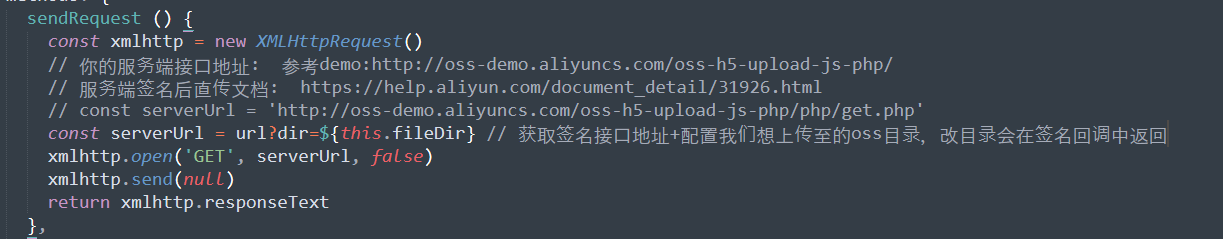 这里后端提供了签名接口,直接调用其接口获取签名。对比js客户端直接签名,js签名会使AccessKeyID和AcessKeySecret暴露在前端页面,有安全隐患。(ps: 咱也不懂哈)