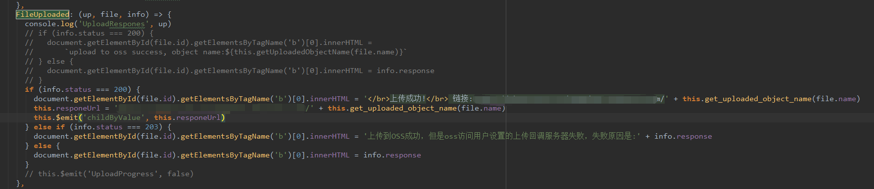 document.getElementById(file.id).getElementsByTagName('b')[0].innerHTML = '上传到OSS成功,但是oss访问用户设置的上传回调服务器失败,失败原因是:' + info.response