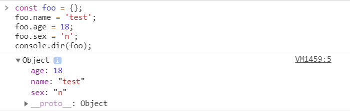 **示例1:**使用 const 声明对象,并给其添加属性值