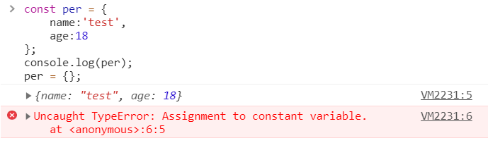 **示例2:**使用const声明对象,然后将另一个对象赋值给该变量