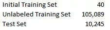 训练集有115,374个被标注的例子。现将这个训练集分为三个集合,即初始训练集、未标注训练集和测试集,具体如下: