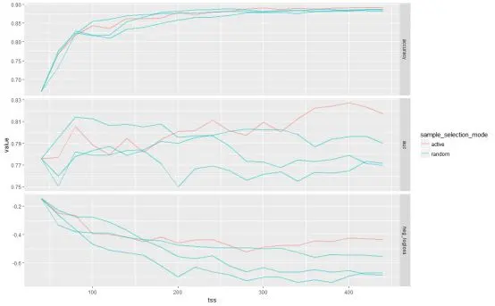 为了比较,可以通过从未标注的训练集中随机抽取任意20个例子来迭代扩展初始训练集。下图比较了主动学习方法(active)和3次随机抽样(random),根据训练集(tss)大小使用不同度量。