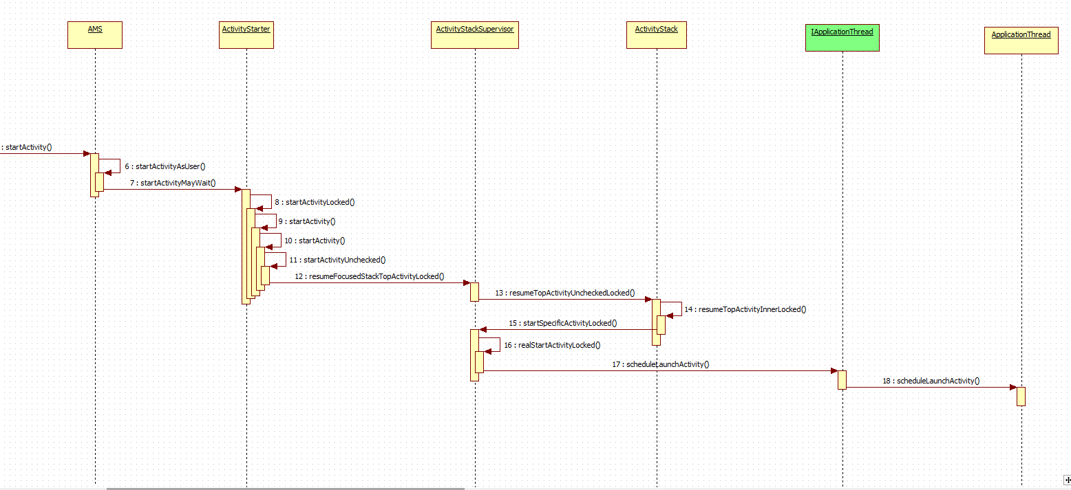 当前的代码逻辑执行在AMS所在进程,从这里开始Activity的启动流程最终又回到了应用进程所在的ApplicationThread中。