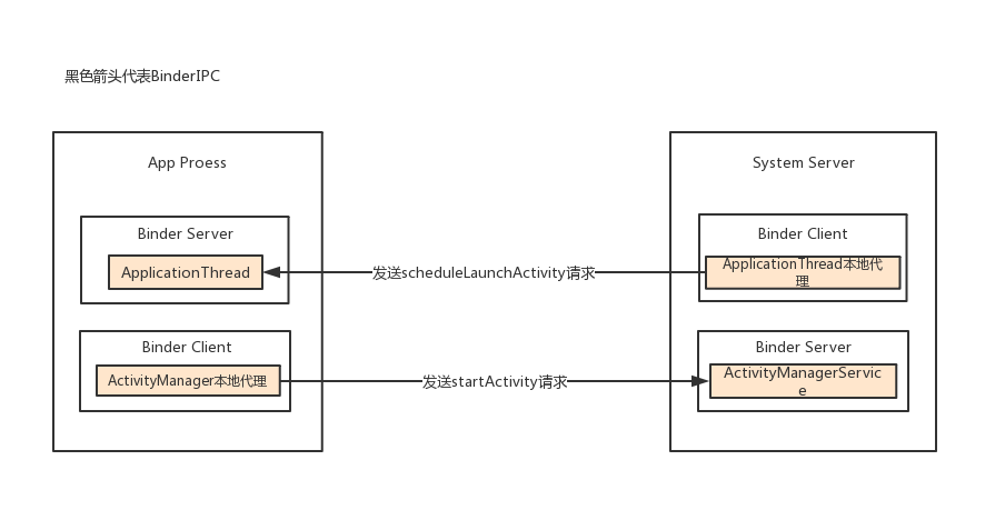 答案是2个,前言已经讲过本文讨论的是普通Activity的启动流程,即我们平时调用startActivity方法来启动一个Activity,所以本文这个过程涉及的进程可以可以用下面这个图表示: