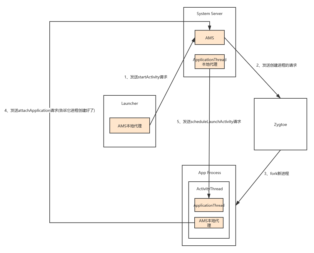 可以看到会涉及Launcher进程、SystemServer进程、App进程、Zygote进程(关于这些进程的简单信息可以看这篇从进程的角度看Android的系统架构),这整个过程如下:首先是点击App图标,此时是运行在Launcher进程, Launcher通过AMS本地代理向AMS发起startActivity请求,AMS收到请求后,发现要启动的Activity的进程不存在,就通过Process.start方法向Zygote进程发送创建进程的请求,Zygote进程收到请求后,fork出新的子进程,即App进程,然后进入ActivityThread.main方法中,这时运行在App进程中,App进程通过AMS本地代理向AMS发起attachApplication请求,AMS接收到请求后,进行一些列准备工作(通知Activity创建Application)后,再通过ApplicationThread向App进程发送scheduleLaunchActivity请求,App进程收到请求后,后面就会进行Activity的生命周期回调。