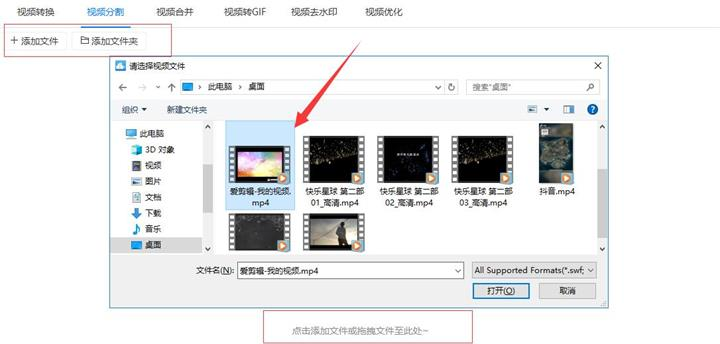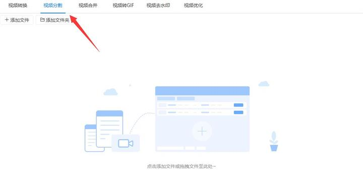 2、选择好“视频分割”功能后把需要去除片头片尾(视频分割)的视频添加到软件,添加时视频少可以点击“添加文件”/“添加文件夹”按钮,视频多可以直接把文件拖拽到软件中。