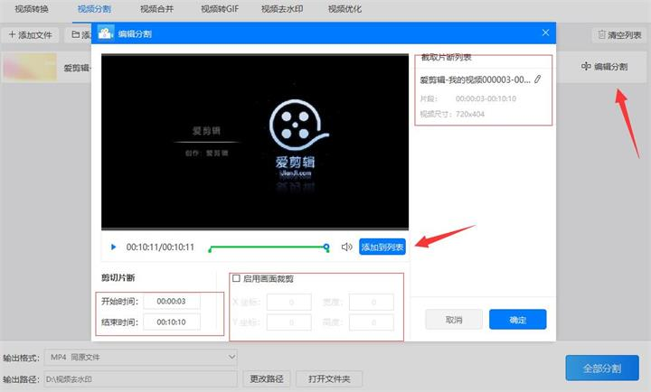 3、添加好需要分割的视频后点击“编辑分割”按钮针对分割的时间段进行调整。调整时需要设置好开始时间和结束时间,需要裁剪视频的长度和宽度也可以勾选启用画面裁剪进行设定。设定好后点击“添加到列表”确定所设定的参数。