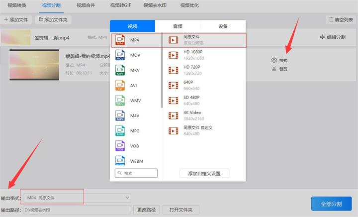 4、设定好“编辑分割”的参数后点击“格式”或“输出格式”调整输出的视频格式和分辨率格式。由于诸多视频格式中mp4的兼容性相对较高且占用内存相对较少所以通常把输出的视频格式设置为‘mp4’格式,而分辨率则可以选择为和原视频相同分辨率的‘同原文件’格式。