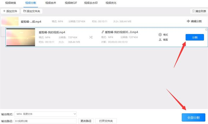 6、设置好“输出路径”后点击“分割”/“全部分割”按钮去除视频的片头片尾(视频分割)。分割时软件会出现一个进度条,当进度条到达100%时就表示视频已经分割好了。最后只需点击覆盖在“分割”按钮上的“打开”按钮就可以找到分割后的视频了。