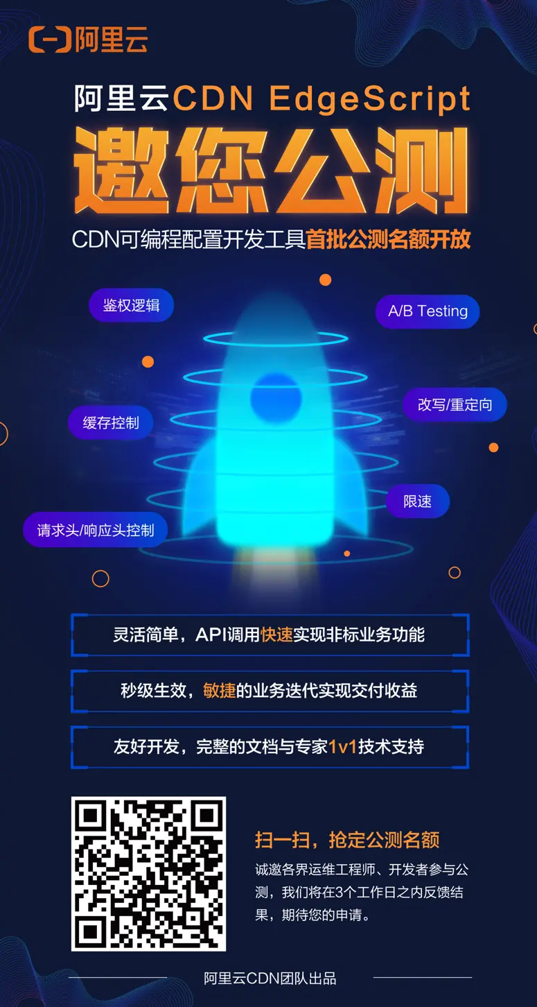 目前,CDN可编程配置开发工具EdgeScript已经开放公测,用户可以通过专题页中的公测入口进行申请,或者提交工单进行申请,申请通过后即可免费试用EdgeScript并获得1v1的技术专家支持,期待各位运维工程师和开发者参与公测。