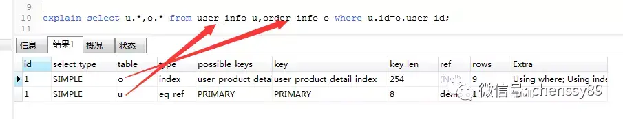 EXPLAIN SELECT u.*, o.* FROM user_info u, order_info o WHERE u.id = o.user_id;
