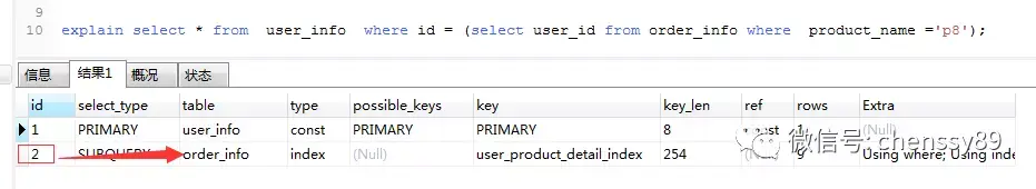 EXPLAIN SELECT * FROM user_info WHERE id = ( SELECT user_id FROM order_info WHERE product_name = 'p8' );