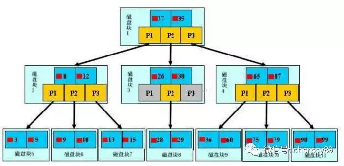 最外层浅蓝色磁盘块1里有数据17、35(深蓝色)和指针P1、P2、P3(黄色)。P1指针表示小于17的磁盘块,P2是在17-35之间,P3指向大于35的磁盘块。真实数据存在于子叶节点也就是最底下的一层3、5、9、10、13......非叶子节点不存储真实的数据,只存储指引搜索方向的数据项,如17、35。