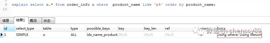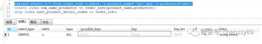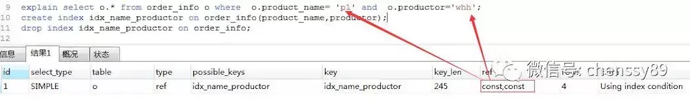 EXPLAIN SELECT o.* FROM order_info o WHERE o.product_name = 'p1' AND o.productor = 'whh';