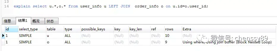 EXPLAIN SELECT u.*, o.* FROM user_info u LEFT JOIN order_info o ON u.id = o.user_id;