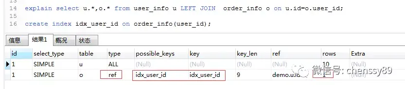 这里面一般有个规律是:左连接索引加在右表上面,右连接索引加在左表上面。