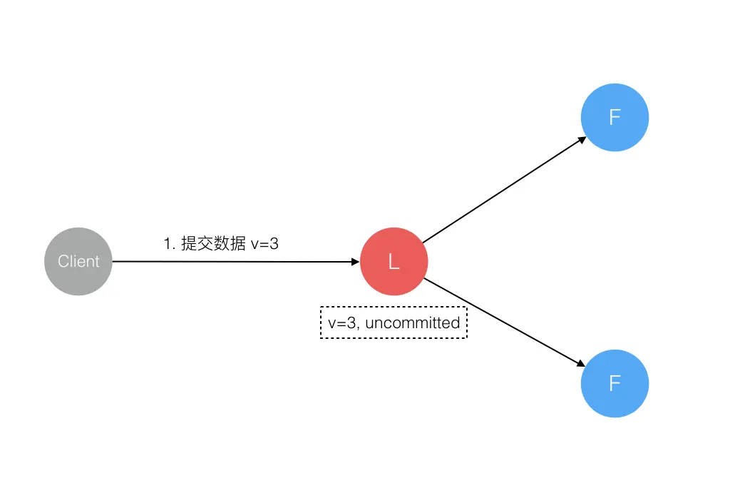 Raft 协议强依赖 Leader 节点的可用性来确保集群数据的一致性。数据的流向只能从 Leader 节点向 Follower 节点转移。当 Client 向集群 Leader 节点提交数据后,Leader 节点接收到的数据处于未提交状态(Uncommitted),接着 Leader 节点会并发向所有 Follower 节点复制数据并等待接收响应,确保至少集群中超过半数节点已接收到数据后再向 Client 确认数据已接收。一旦向 Client 发出数据接收 Ack 响应后,表明此时数据状态进入已提交(Committed),Leader 节点再向 Follower 节点发通知告知该数据状态已提交。