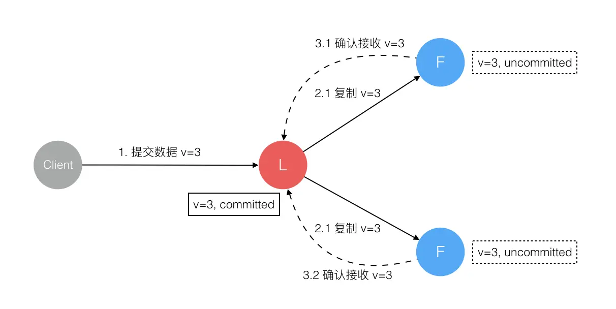 5. 数据到达 Leader 节点,成功复制到 Follower 所有或多数节点,数据在 Leader 处于已提交状态,但在 Follower 处于未提交状态