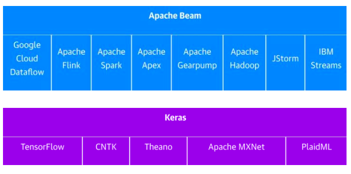 几个重要的新项目结构不同。它们没有执行引擎;相反,它们是为几个不同的执行引擎提供公共接口的元框架(metaframeworks)。Keras 是第二大流行的深度学习框架,就是这种趋势的一个例子。正如创建者 François Chollet 最近试图解释的那样,“Keras 是一个接口,而不是一个端到端的框架。”同样的,Apache Beam,一种大型数据处理框架,也是一种自我描述的“编程模型”。这是什么意思呢?你能用自己的编程模型来做什么呢?答案是:真的并不能做什么,因为这两个项目都需要外部的后端。就拿 Beam 这种例子来说,用户编写的管道可以在八个不同的“运行器(runner)”上执行,包括六个开源系统(其中五个来自 Apache)和三个专有的厂商系统。同样的,Keras 也支持 TensorFlow、微软认知工具包(Microsoft’s Cognitive Toolkit,CNTK)、Theano、Apache MxNet 等。Chollet 在 GitHub 最近的一次交流中简要描述了这种方法:“事实上,我们将来甚至会扩展 Keras 的多后端的方面。……Keras 是深度学习的前端,而不是 TensorFlow 的前端。”