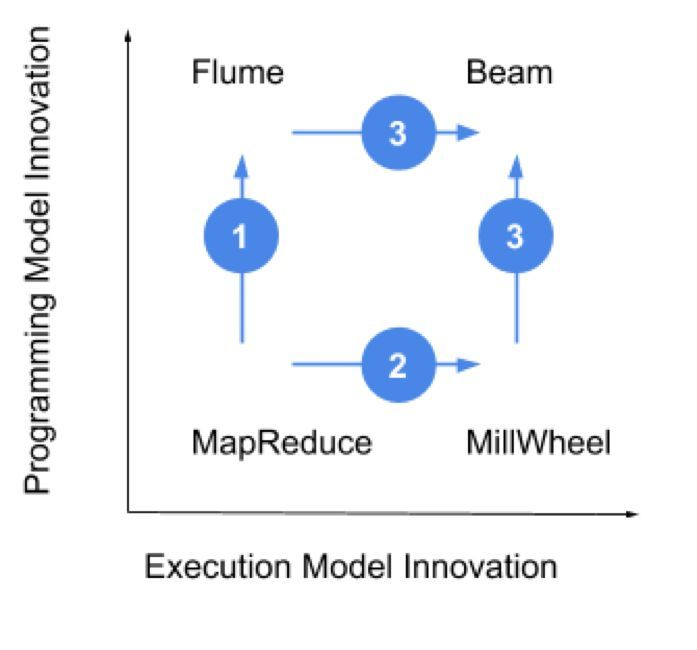 2015 年,我在 Google 担任产品经理,专注于 Cloud Dataflow(云数据流)。Dataflow 工程团队的传奇地位可以追溯到 Jeff Dean 和 Sanjay Ghemawat 于 2004 年发表的著名论文 MapReduce。与大多数项目一样,MapReduce 定义了一种执行方法和一种编程模型来利用它。虽然执行模型仍然是批处理的最新技术,但使用编程模型的体验并不那么令人愉快,因此 Google 很快就开发了一个更简单的抽象编程模型 Flume(图 1 的第一步)同时,对低延迟处理的需求,导致了一个新的项目,该项目使用通常的执行模型和编程模型,成为 MillWheel(即图 1 中的第二步)。有趣的是,这些团队围绕着这样的一个想法走到了一起,Flume 是用于批处理的抽象编程模型,带有一些扩展,也可以是流的编程模型(第三步)。这一关键见解是 Beam 编程模型的核心,当时称为 Dataflow Model(数据流模型)。