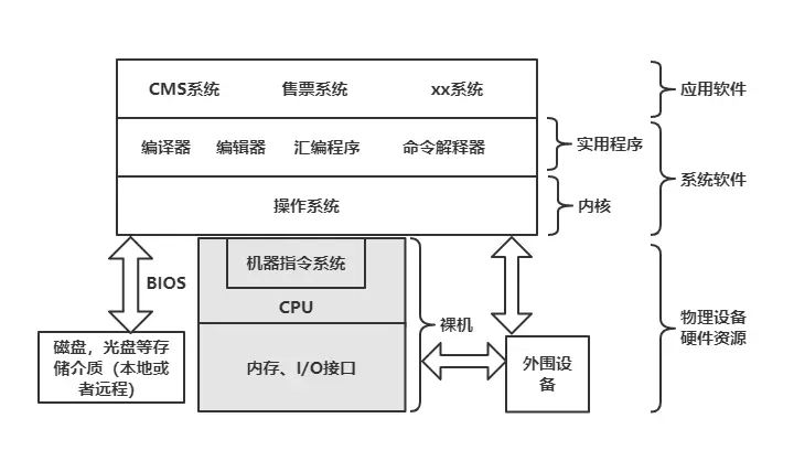 CPU、内存和I/O接口组成的主设备通常称为主机,把没有加载操作系统的主机叫做裸机。裸机与操作系统软件的接口是由CPU的指令系统和厂商提供的系统BIOS组成。